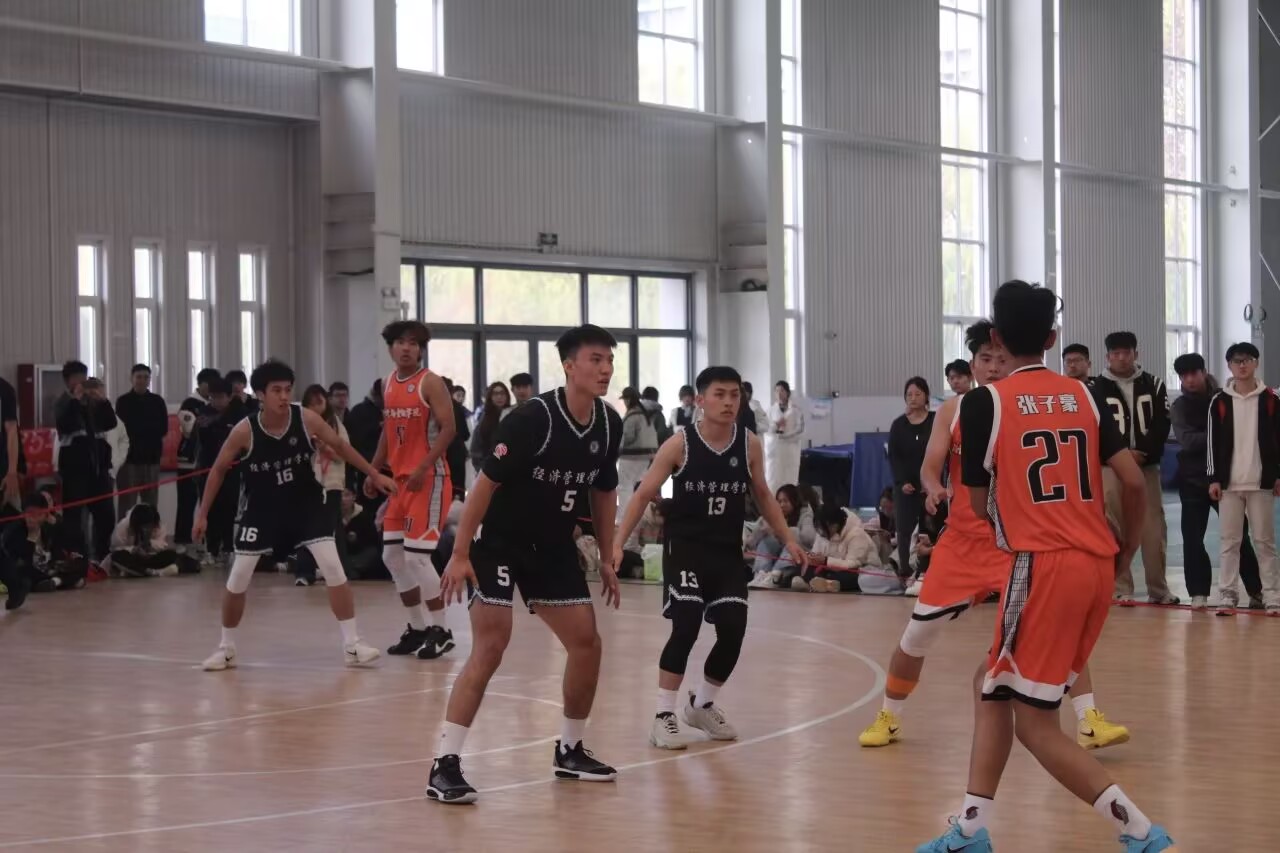 比赛伊始,双方迅速进入状态。经济管理学院代表队凭借默契的团队配合与稳定的投篮手感率先得分,迅速占据场上主动。会计与金融学院代表队则依托灵活的外线传导与精准的中投紧咬比分,双方攻防转换迅速,场上节奏紧凑激烈。随后,经管队员凭借过硬的技术和出色的协作连续命中两记三分球,将现场氛围推向高潮。会计队亦不甘示弱,通过顽强防守和果断出手力图扳回局势,比分一度胶着。上半场结束时,场上气氛紧张热烈,经管学院拉拉队登场助威,用整齐的舞姿与热情的呐喊为队员加油鼓劲,现场掌声与喝彩声此起彼伏。