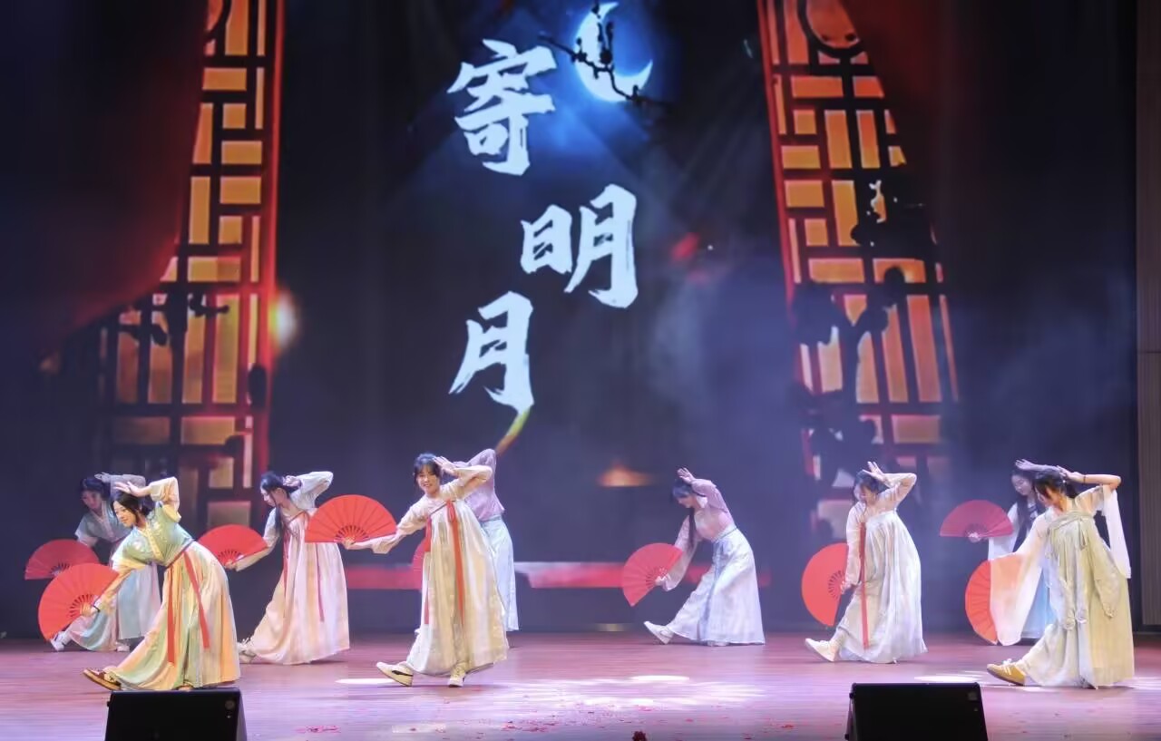 一曲《寄明月》,舞者们衣袂飘飘,以轻盈的旋转、舒展的动作,勾勒出“明月寄相思,山河入我怀”的唯美意境,每一帧都是对中华文化的深情礼赞。《屠呦呦》情景剧亮相舞台,以戏剧之形传榜样之志,让科研精神与家国情怀深深扎根于心。《万疆》歌颂舞,一舞一腔皆藏家国情怀,经管青年用青春姿态诠释赤子之心。