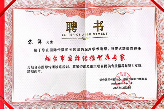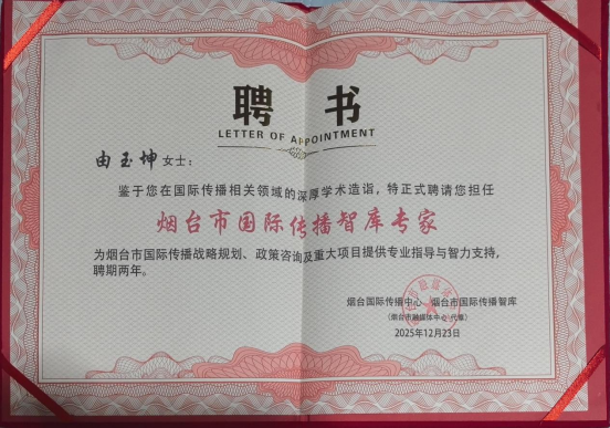 我院两位获聘专家将持续为烟台市国际传播战略规划、政策咨询及重大项目提供专业指导和智力支持,提升烟台在国际传播领域专业化、国别化和创新化水平。